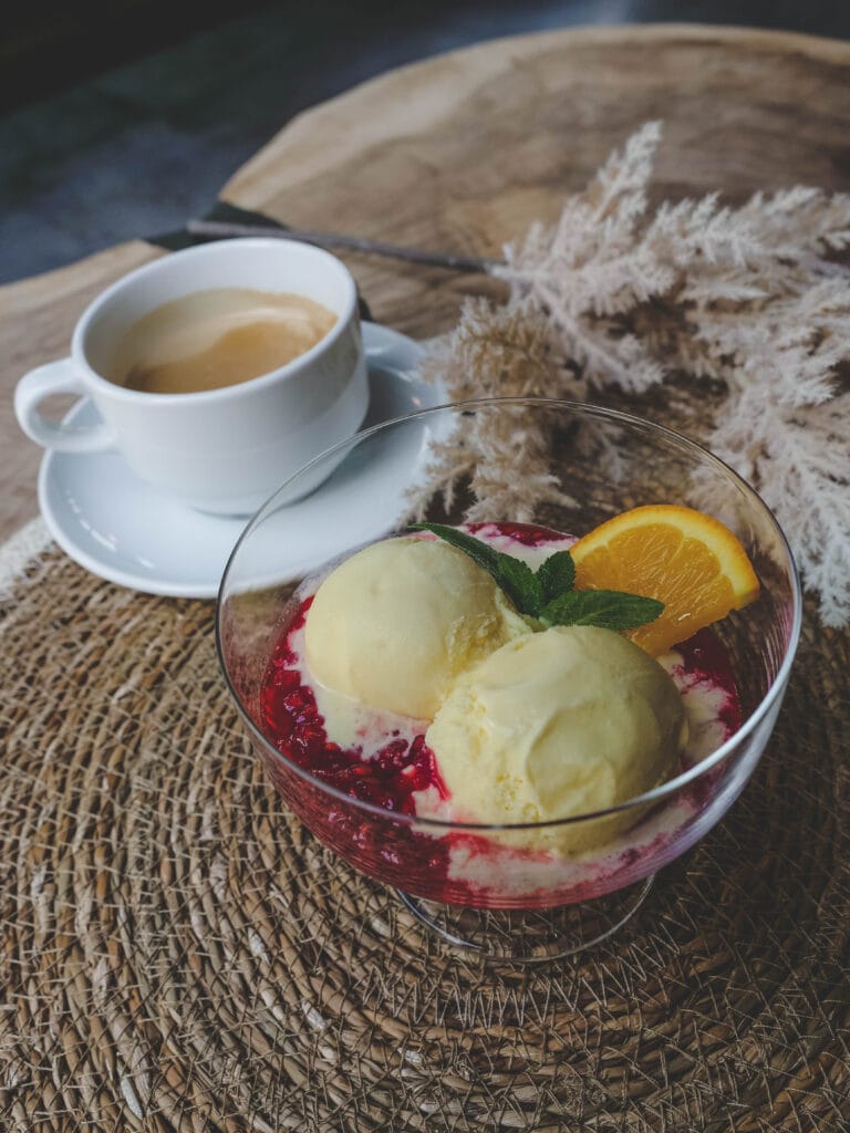 Lody waniliowe z musem malinowym i świeżą miętą