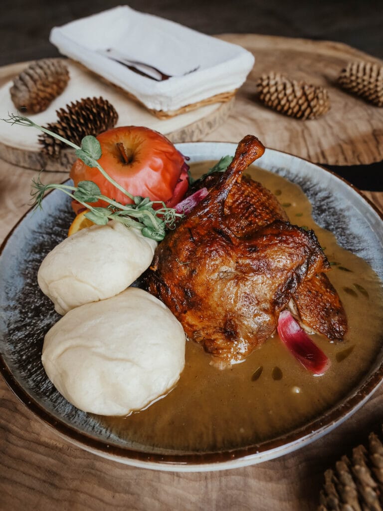 Kaczka z pyzami oraz modrą kapustą