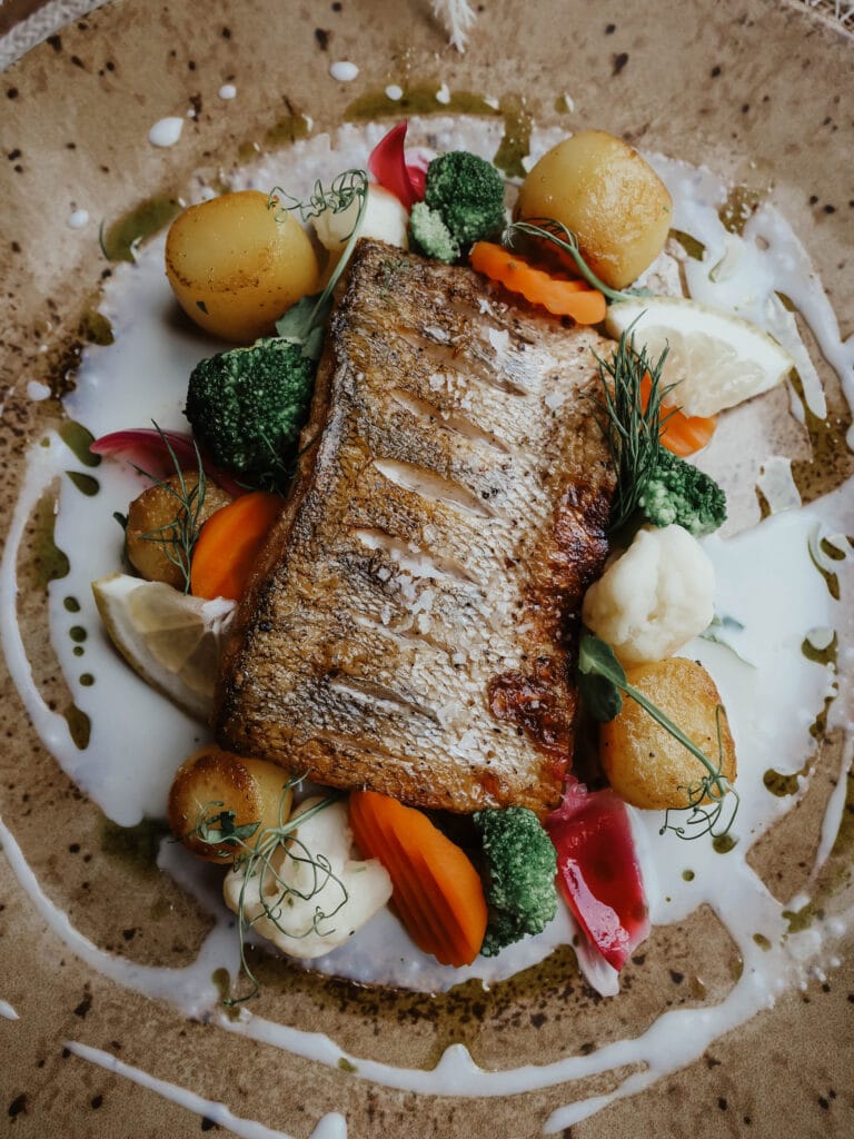 Sandacz saute z sosem buerre blanc, ziemniakami fondant oraz warzywami na parze