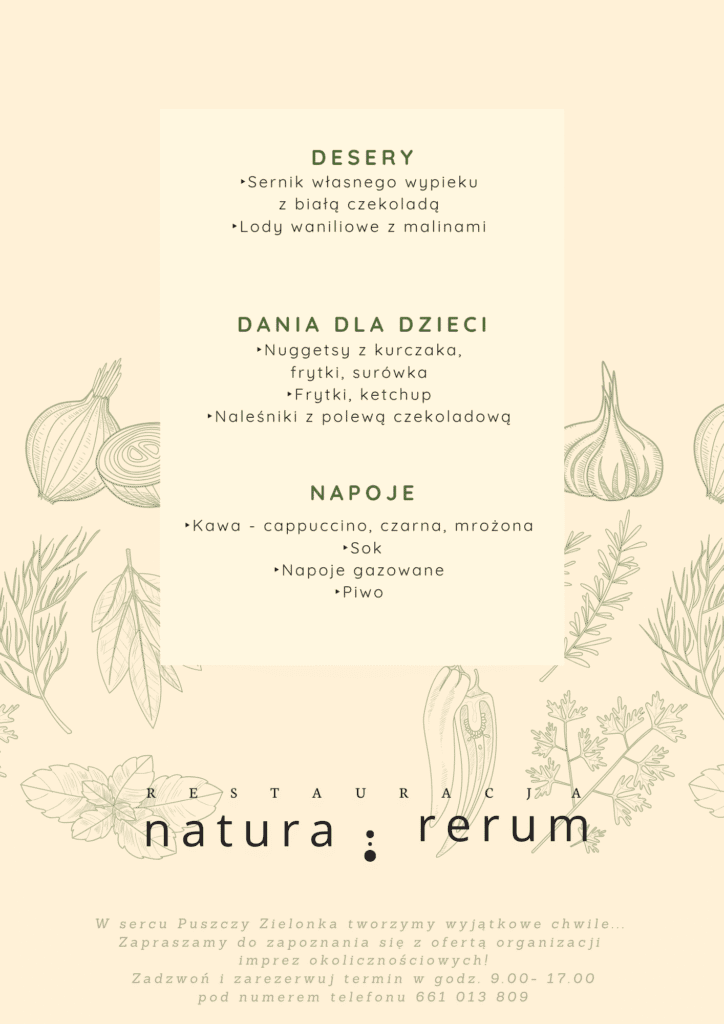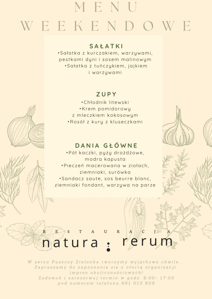 Z ogromną przyjemnością zapraszamy Państwa na uroczyste otwarcie restauracji Natura Rerum – wyjątkowego miejsca, które powstało z miłości do tradycyjnej kuchni polskiej i szacunku do otaczającej przyrody. W sercu Puszczy Zielonki czeka na Państwa niezapomniane kulinarne doświadczenie w spokojnej, malowniczej scenerii.